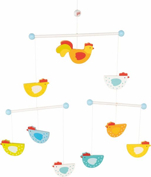 Das farbenprächtige Hühnermobile - Kinder lieben Hühner! Und sie werden es lieben den bunten Hühnern zuzusehen, wenn sie sich über ihren Betten oder vor ihren Kinderzimmerfenstern ganz ruhig, wie von Zauberhand geführt, in der bewegten Luft drehen. Doch nicht nur Kinder lieben Hühner und so haben schon so einige Mobiles ihre Plätze vor einem zuvor tristen Küchenfenster zur Freude der ganzen Familie gefunden. Es handelt sich also offensichtlich bei diesem goki Holzmobile um einen verspielten Dekorationsartikel für alle Hühnerfreunde.