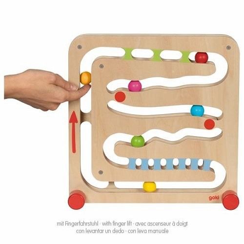 goki exklusiv Kugelbahn. Diese Kugelbahn verspricht zu Recht ein völlig neues Kugelbahnerlebnis. Mit dem "Fingerfahrstuhl" werden die Kugeln nach oben auf die Startbahn transportiert - das fördert die motorischen Fähigkeiten und lässt das Kind aktiver am Spiel teilhaben. Die Holzkugeln laufen innerhalb der Bahn über die äußerst attraktiven Rampenverläufe und können nicht verloren gehen. Die 6 Kugeln lassen schon erahnen, wie temporeich das Spiel mit diesem Holzspielzeug gestaltet werden kann. Fazit: Eine tolle neue Spielidee.
