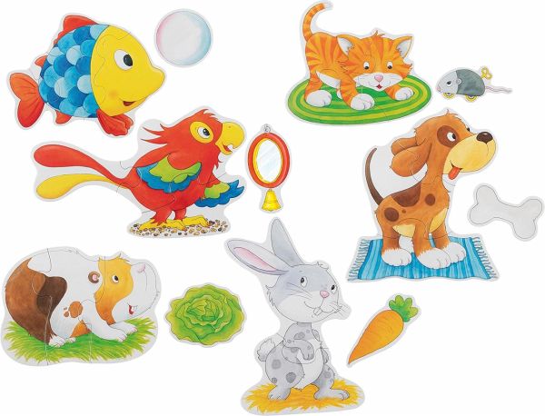 Das große Puzzle-Set der Haustiere. Die liebevoll illustrierten niedlichen Haustiere wollen einfach zusammengepuzzlet werden. Die Puzzleteile sind aus hochwertiger, fester Pappe gefertigt. Alle Tiere werden aus 3 großen Puzzleteilen zusammengesetzt, sodass sich eine Tiergröße von ca. 22x22 cm (Hund) ergibt. 6 zusätzliche Elemente können den Tieren zugeordnet werden, so erhält das Puzzle ein zusätzliches Spielelement. Alle Puzzleteile können nach dem Spielen wieder in eine feste Box mit Stülpdeckel zurückgelegt werden. So geht kein Teil verloren und der Puzzlespaß kann jederzeit wieder von neuem beginnen.