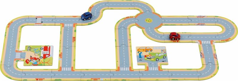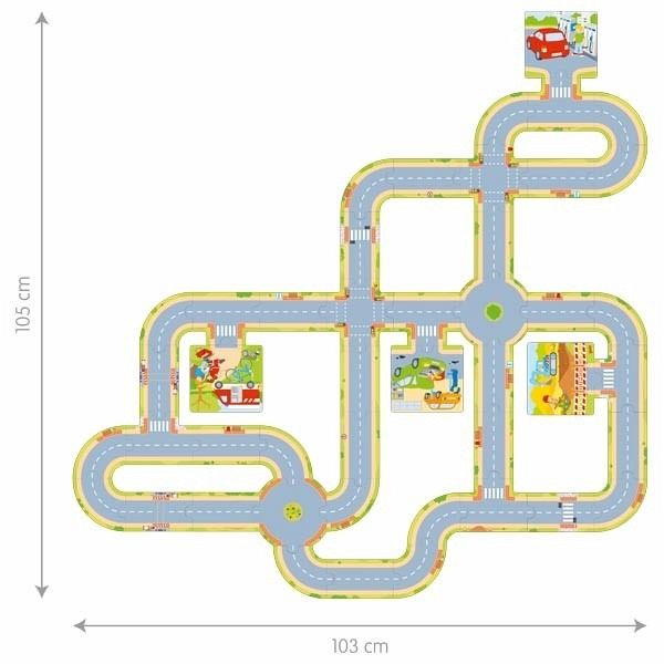 Für begeisterte Rennfahrer: die Spielstraße aus bodenschonender Pappe kann nach Belieben zusammengesetzt werden. Neben Straßen, Kurven und Kreuzungen gibt es auch Kreisverkehr und Parkbuchten. 2 Spritzgussfahrzeuge gibt es auch noch dazu.