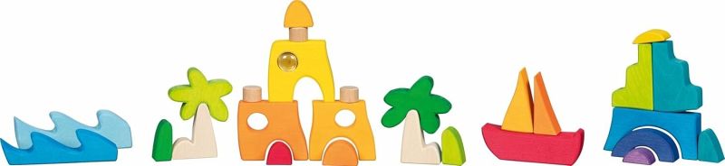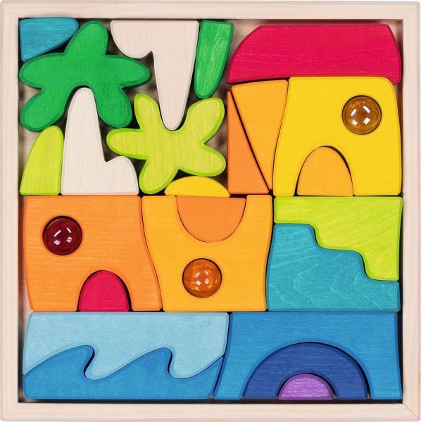 Glitzersteine aus Glas treffen in diesem Landschaftspuzzle auf bunte Bausteine aus Holz. Die unterschiedlich geformten Elemente ergeben aufgebaut immer wieder neue Bauten, Landschaften und Abenteuer. Jede Spielwelt ist mit diesem Puzzle einzigartig.