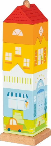 Ein kunterbunter Turm aus Holz. Damit die Stadtvilla aber wirklich so schön aussieht und sich in die Höhe reckt, müssen erst 6 Klötzchen passgenau aufeinandergesetzt werden. Gott sei Dank hält der Stab in der Mitte alles im Lot. Wenn es denn richtig gestapelt wurde. So wird das Formenverständnis mit diesem Stapelturm spielerisch geschult.