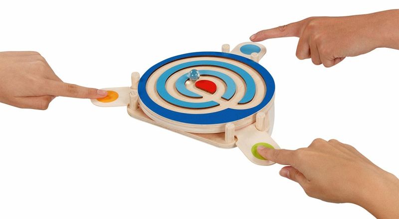 Bei diesem Holzspielzeug ist Geschicklichkeit im Team gefragt, um die Kugel ans Ziel zu bringen. Von beiden Seiten bespielbar.