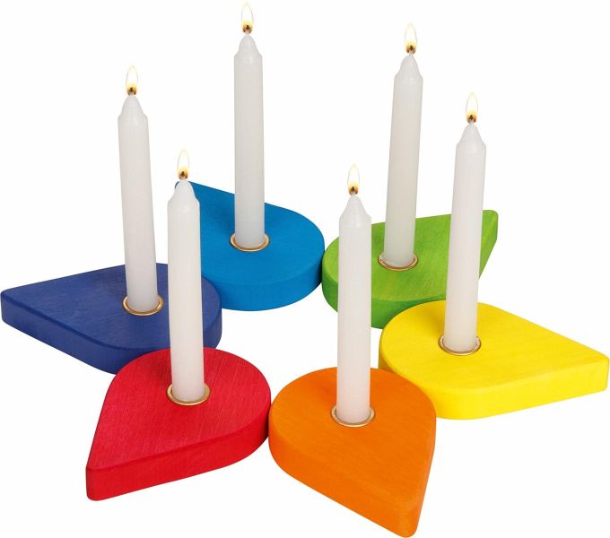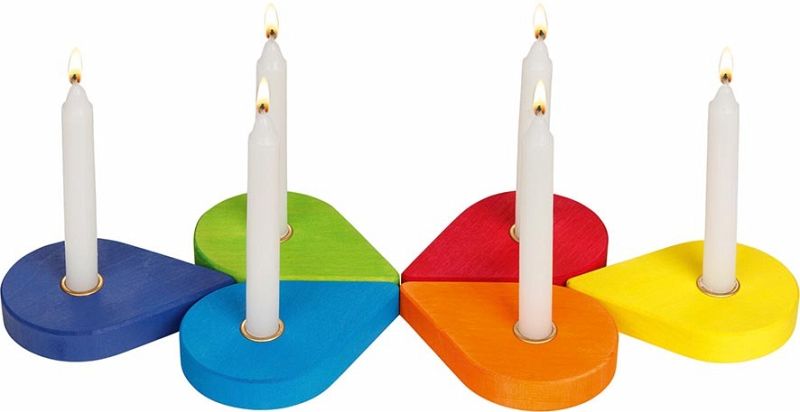 Geburtstagskranz einmal anders (goki evolution): die 6 Kerzenhalter aus Holz leuchten in den Farben des Regenbogens und können individuell und kreativ auf dem Geburtstagstisch angeordnet werden.