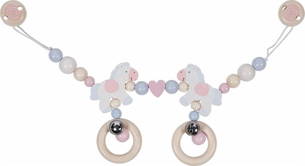 Die niedliche Kinderwagenkette in dezenten Pastelfarben, mit zwei süßen Pferdchen, zwei Holzringen und zwei kleinen Glöckchen lädt alle Sinne zur Entdeckung ein und sorgt für Unterhaltung und Ablenkung im Kinderwagen und auf Reisen. Sie ist ein idealer Begleiter auf den täglichen Ausfahrten. Mit Hilfe der beiden Clips an beiden Enden lässt sich die Wagenkette auf einfache Weise an so gut wie jedem Kinderwagen befestigen. Die visuelle Wahrnehmung des Babys wird dadurch gefördert. Die Elemente der Kinderwagenkette werden mit Farben auf Wasserbasis hergestellt, deshalb sind sie ungiftig, speichelecht und schweißecht. Sie werden in Deutschland von Hand gefertigt. Die hochwertige Faltschachtel mit Fenster eignet sich sehr gut zum Verschenken.