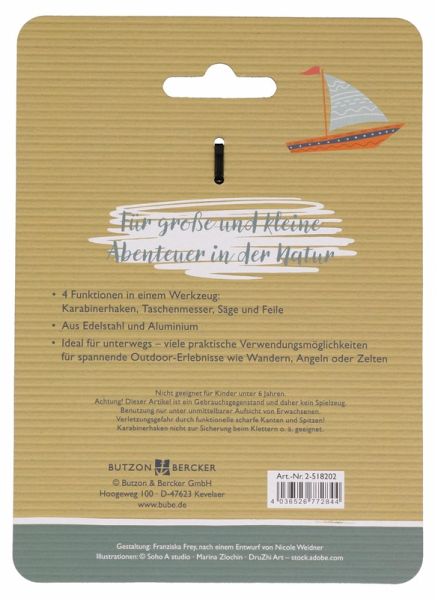 Für große und kleine Abenteuer in der Natur4 Funktionen in einem Werkzeug: Karabinerhaken, Taschenmesser, Säge und Feile.Dieser Multifunktions-Karabiner ist die optimale Grundausstattung für jeden kleinen Abenteurer und Naturentdecker!Der Karabinerhaken kann ganz leicht an Hose, Gürtel, Rucksack oder Schlüsselbund befestigt werden und ist so immer in Reichweite. Mit den vielen praktischen Verwendungsmöglichkeiten ist er der ideale Begleiter für unterwegs - egal ob beim Wandern, Angeln, Zelten oder anderen spannenden Outdoor-Erlebnissen in Gottes schöner Welt.- 4 Funktionen in einem Werkzeug: Karabinerhaken, Taschenmesser, Säge und Feile- Aus Edelstahl und Aluminium- Ideal für unterwegs - viele praktische Verwendungsmöglichkeiten für spannende Outdoor-Erlebnisse wie Wandern, Angeln oder Zelten