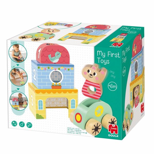 Das Set besteht aus drei Teilen, die für verschiedene Lernstufen konzipiert sind und ein progressives Lernen ermöglichen. Wenn das Kind aufwächst, spielt es mit allen Teilen zusammen, indem es zuerst die Rassel auf das Auto setzt und danach auch mit den Blöcken spielt.