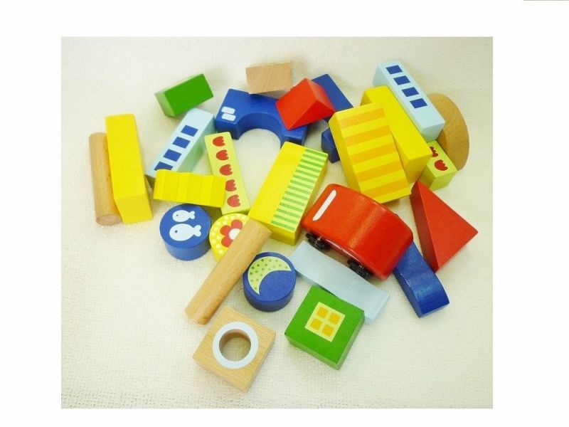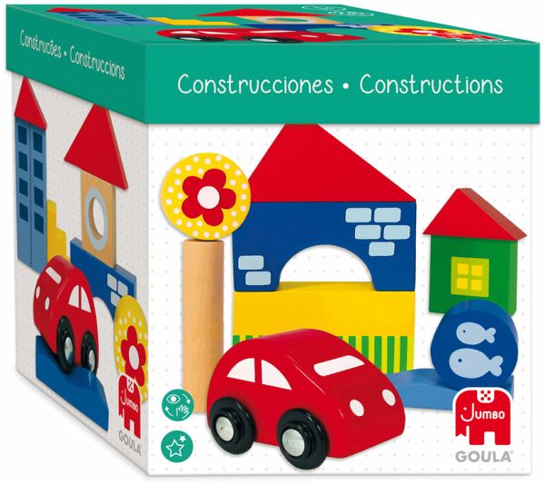 Bau geometrischer Formen, 26 Teile. Mit den verschiedenen Holzformen werden auf spielerische Weise Konstruktionen gebaut. Das Spiel umfasst auch ein Auto mit Rädern. Originelle Formen und bunte Farben. Fördert die Entwicklung von Fantasie und Auge-Hand-Koordination. Das Kind lernt verschiedene geometrische Formen.