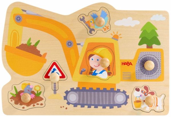 Auf der Baustelle gibt?s viel zu tun und alle helfen mit. Wer kann den Baggerfahrer, das Baustellenschild und die anderen Helfer richtig platzieren? Große Teile mit griffigen Holz-Knöpfen erleichtern das Puzzeln und sorgen für schnelle Erfolgserlebnisse.