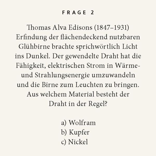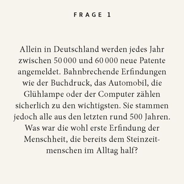 Wer hat's erfunden? Gibt es etwas Spannenderes, als mehr über die Errungenschaften zu erfahren, die unsere Welt von heute gestaltet haben und die Zukunft von morgen bestimmen? Die Kreativität des Menschen kennt keine Grenzen, wenn es darum geht, unser Leben zu verbessern - ob in Medizin, Forschung und Wissenschaft, Kultur, Medien oder Ingenieurskunst. 100 Fragen und Antworten liefern staunenswerte Geschichten und sorgen für eine geniale Erweiterung des eigenen Horizonts.Stilvoll, elegant und immer eine gute Idee: Die Reihe "Quiz im Quadrat" präsentiert sich in modernem Design und sorgt für unterhaltsamen Rätselspaß - verpackt in einer edlen Geschenkbox. Perfekt als besondere 'Grußkarte' mit Mehrwert - zum Verschenken oder Selberfreuen!