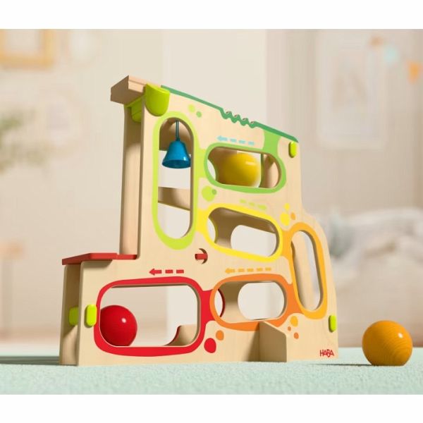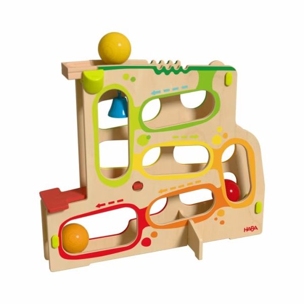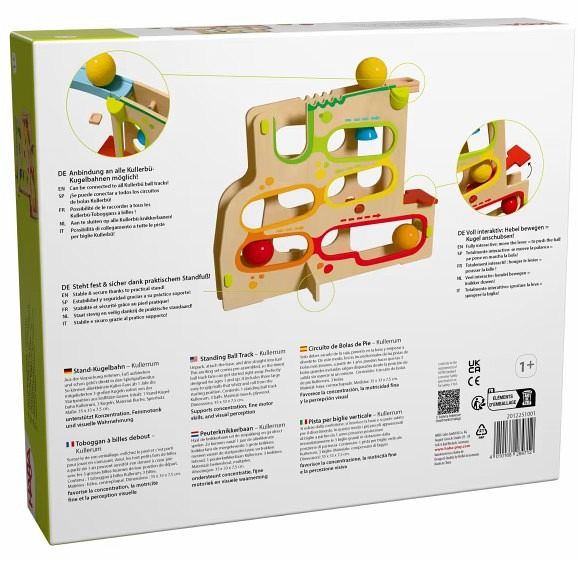 Aus der Verpackung nehmen, Fuß aufstecken und schon geht's direkt in den Spielspaßmodus mit der HABA Stand-Kugelbahn Kullerrum. Bereits fertig montiert, kommt die Kugelbahn aus der Verpackung. So können allerkleinste Kuller-Fans ab 1 Jahr die mitgelieferten 3 großen Kugeln sofort von der Startposition aus losflitzen lassen. Schwupps, schon streift eine Kugel die Glocke und ein fröhliches Klingeln ertönt. Flott geht's weiter bis zum interaktiven Highlight, dem Hebel. Ab hier rollt die Kugel nur noch durch die Hilfe der Kinder weiter: Hebel nach oben bewegen, schon wird die Kugel angeschubst - auf in die letzte Kurve und mit Vollgas ins Ziel! Schon gewusst? Die Stand-Kugelbahn Kullerrum lässt sich ganz leicht per Anklicken mit den HABA Kullerbü-Systemen verbinden.