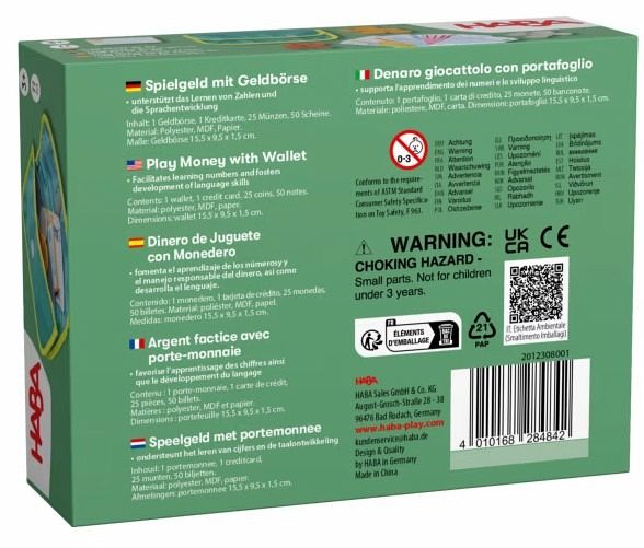 Mit diesem vielseitigen Spielgeld-Set wird der Einkauf zum spannenden Erlebnis! Enthalten sind farbenfrohe Holzmünzen und Geldscheine, eine praktische Kreditkarte und eine schicke Geldbörse, die perfekt für kleine Kaufleute geeignet ist. Ideal für Rollenspiele im Kaufladen oder beim "Einkaufen" zu Hause, fördert dieses Set das Verständnis für Geldwerte und Zahlen.
