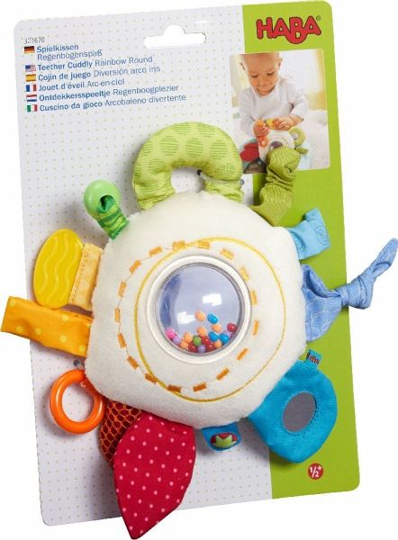 Das bunte Spielkissen Regenbogenspaß von HABA bietet Babys und Kleinkindern ab 6 Monaten, alles, was sie zum Spielen und Entdecken brauchen. Unterschiedliche Farben, Materialien und Effekte wecken den Entdeckergeist und beflügeln die Wahrnehmung der Kinder. Beim Greifen, Kauen, Halten, Schütteln und Ziehen trainieren schon die Kleinsten wichtige motorische Fähigkeiten. Das Rasselelement mit Spiegelfolie und vielen bunten Kugeln sorgt dafür, dass der Spielspaß niemals aufhört. Ein detailreich gestaltetes Babyspielzeug aus Stoff für Kinder ab 6 Monaten von HABA.