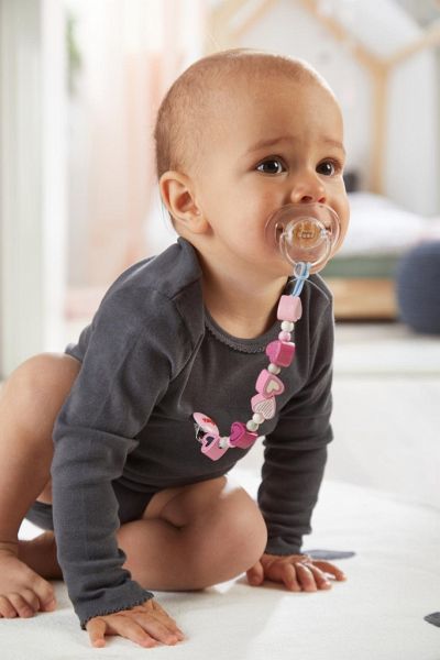 Mit der Schnullerkette Funkelherz ist der Schnuller immer schnell griffbereit, wenn er gebraucht wird. Und der praktische Clip hält den Schnuller immer dort, wo er hingehört.