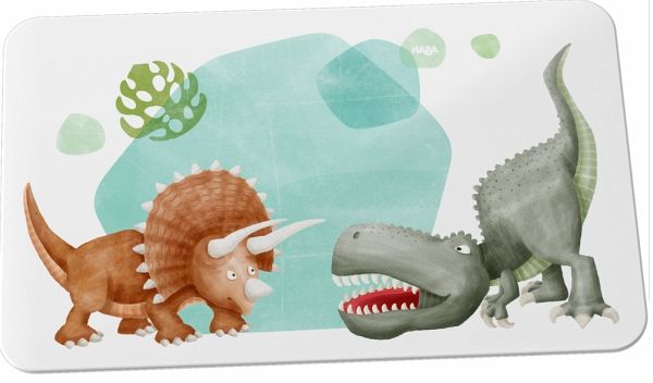 Vom Frühstück bis zur Brotzeit im Freien das Brettchen von HABA begeistert alle kleinen Dino-Fans. Die beiden frechen Dinos bringen gute Laune mit. Auf der Rückseite hat das Frühstücksbrettchen für Kinder Gumminoppen, die es am Rutschen hindert. So können Kleinkinder prima darauf das selbstständige Essen üben sogar mit Gabel und Messer. Das Kinderbrettchen ist aus robustem Melamin und ganz einfach in der Spülmaschine zu reinigen. Es ist Teil der Geschirrserie Dinos von HABA. Die drolligen Saurier begleiten Kinder auf vielen praktischen Utensilien zu Hause und unterwegs. Kindgerechtes Design von HABA.