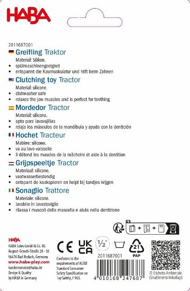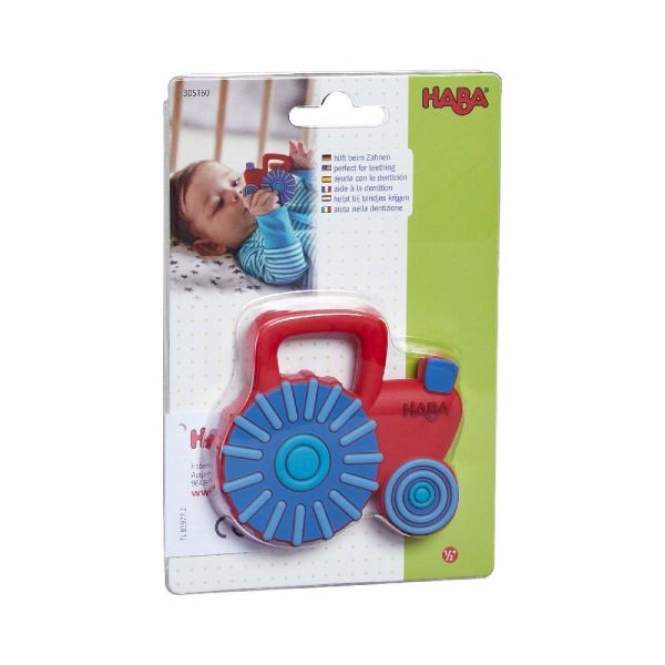 Der Traktor ist für zahnende Babys ein nützlicher Helfer. Das Kauen auf seinen unterschiedlichen Oberflächen bietet viel Abwechslung und bringt schnelle Entspannung. Babys können den Greifling auch gut mit ihren Händen fassen.
