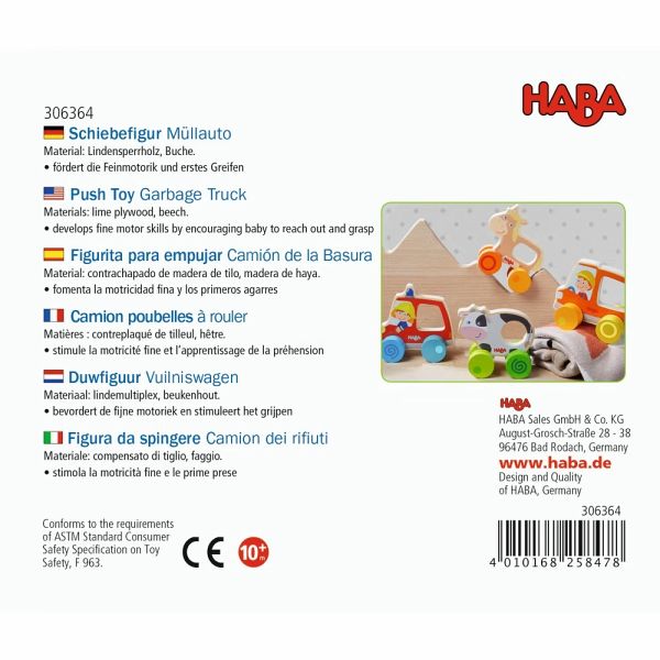 HABA 306364 - Schiebefigur Müllauto, Holz-Auto, Länge: 10 cm