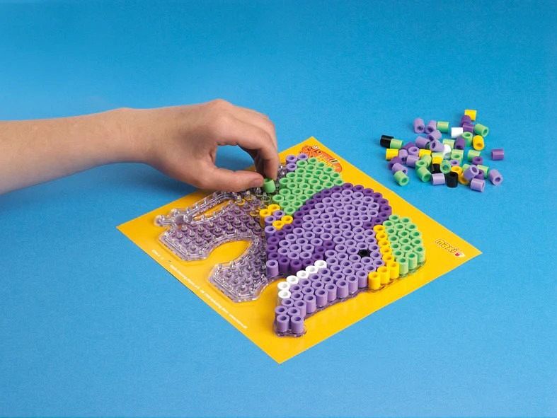 Das Bügelsystem ist sicher das bekannteste. Die Perlen werden auf eine Stiftplatte aufgesteckt und dann gebügelt (von einem Erwachsenen!), bis sie verschmolzen sind.
