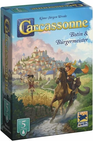 In der 5. Erweiterung Botin & Bürgermeister für das preisgekrönte Familienspiel Carcassonne (Spiel des Jahres 2001) werben Bürgermeister um die Gunst eurer Ritter und werden ins Rathaus beordert. Setzt euren Bürgermeister in fremde Städte und konvertiert gegnerische Meeple. Mit eurer Botin und dem Strohmann könnt ihr zusätzlichen Einfluss ausüben. Ist die Straße der Botin fertig, reitet sie zur nächsten Straße oder in die Stadt. Platziert euren Strohmann auf fremden Wiesen, um Bäuerinnen einzuschleusen.
