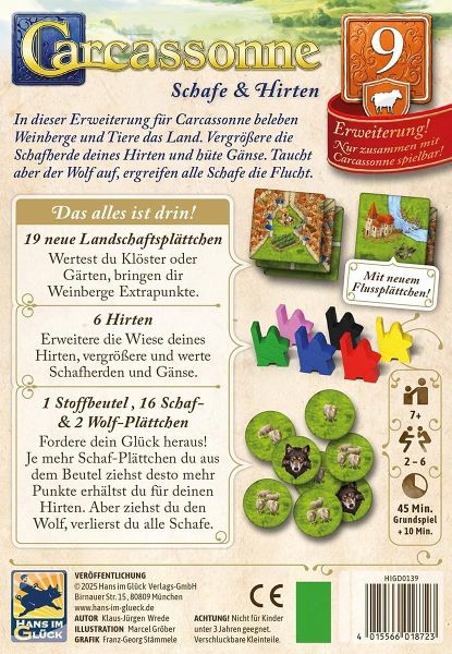 In der 9. Erweiterung Schafe & Hirten für das preisgekrönte Familienspiel Carcassonne (Spiel des Jahres 2001) beleben Weinberge und Tiere das Land. Bei der Wertung von Klöstern oder Gärten bringen Weinberge Extrapunkte. Vergrößert die Schafherden eurer Hirten und hütet Gänse. Fordert euer Glück heraus: Je mehr Schaf-Plättchen ihr aus dem Beutel zieht, desto mehr Punkte erhaltet ihr für euren Hirten. Taucht aber der Wolf auf, ergreifen alle Schafe die Flucht und ihr verliert alles.