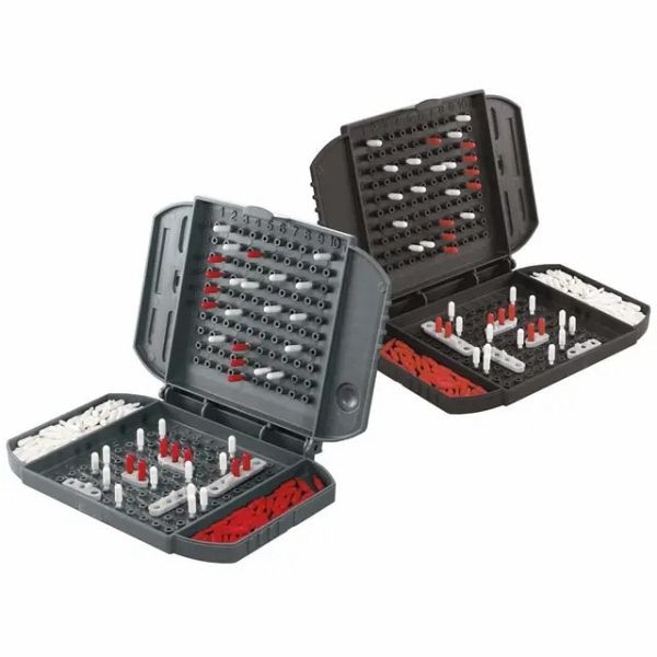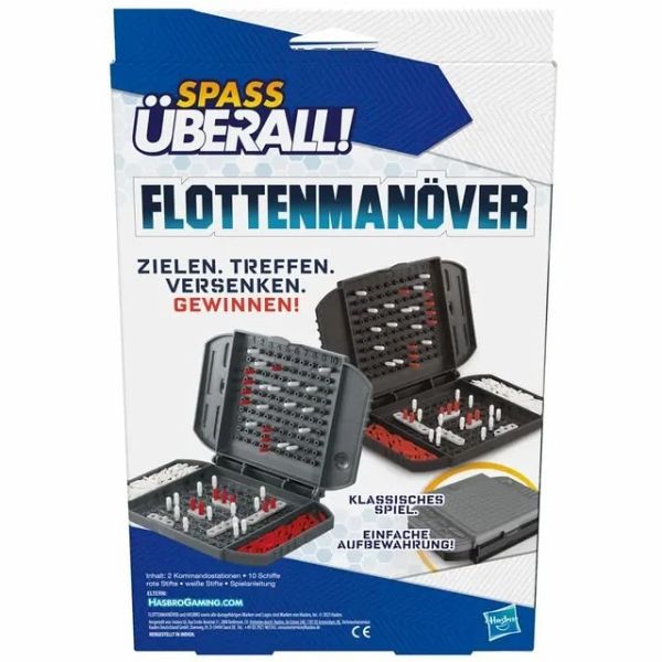 Bei Flottenmanöver Kompakt führen 2 Spieler ihre Flotte auch unterwegs zum Sieg! Das Spiel bietet denselben klassischen Spielablauf in einem kompakten Format! Wer schafft es, alle gegnerischen Schiffe zu versenken, bevor die eigenen untergehen? Die Spieler lenken die Schlacht von der aufklappbaren Kommandostation aus und setzen ihren Flugzeugträger, ihr Schlachtschiff, U-Boot, ihren Zerstörer und Kreuzer auf dem eigenen Meeresraster ein. Das tragbare Reisespiel Flottenmanöver Kompakt für 2 Spieler ab 7 Jahren ist ideal, um es überall unterwegs zu spielen. Es ist einfach aufzubauen und alle Spielteile lassen sich im Inneren aufbewahren. Ist die Schlacht vorbei, werden die Stifte in den Kommandostationen verstaut und diese zusammengeschoben. Flottenmanöver Kompakt bietet eine große Schlacht auf den Weltmeeren in einem kompakten Format für unterwegs! Englische Ausgabe. Hasbro Gaming sowie alle dazugehörigen Begriffe sind Marken von Hasbro.