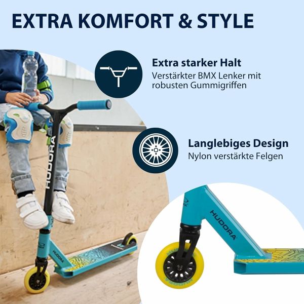 Stunt Scooter für Kinder Hochwertiges T5 Aluminium Hinterrad-Flex-Reibungsbremse aus Manganstahl Verstärkter BMX Lenker 50 x 50 cm 360° Lenkung mit Neco Steuerungssatz Wartungsarmes integriertes Kompressionsystem Verschweißte Gabel Robuste Gummigriffe, Länge 135 mm Downtube aus Vierkant Aluminium Dreifachklemme Lenkerhöhe ca. 75 cm Maße: Länge ca. 67,5 cm Trittfläche ca. 34 x 11 cm High-Rebound Rollen 100 mm # x 24 mm aus gegossenem PU, 88 A Nylon verstärkte Felgen Kugellager ABEC 9, Chrom Gewicht ca. 3,6 kg Max. Benutzergewicht 100 kg