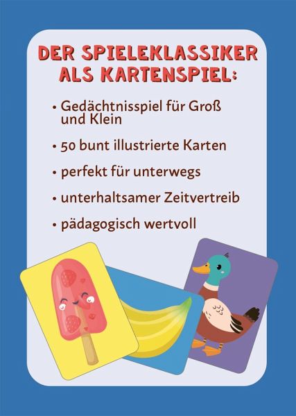 Inhalt: 50 bunt illustrierte Spielkarten Spielprinzip: Karten werden nacheinander vom Stapel genommen und in der richtigen Reihenfolge werden die darauf abgebildeten Gegenstände wiederholtVerpackung: Die Kartenbox ist super geeignet zum Mitnehmen - ob im Flugzeug, Zug, Auto oder UrlaubLerneffekt: Schulung der Konzentration, der Gedächtnisleistung und der FeinmotorikGeschenkidee: Ideales Mitbringsel für Kinder ab 5 Jahren