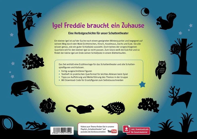 Ein schwarzer Bühnenrahmen, der mit einer matt-weißen Leinwand bespannt ist: Das ist das Don-Bosco-Schattentheater. Auf der Spielerseite können die Kulissen und Figuren seitlich eingeschoben und festgestellt werden. Darüber hinaus lassen sich durch die Führungsrille auch Figuren und Kulissenelemente ziehen - für ein vielfältiges und kreatives Bespielen.Wenn sich der kleine Igel mit seinen tierischen Freunden über das ideale Winterquartier berät, entsteht nicht nur eine bezaubernde Herbstatmosphäre, es bieten sich auch zahlreiche Gesprächsanlässe. Was tun Tiere im Winter? Wer schläft in einem Versteck, wer macht sich im Schnee auf mühsame Nahrungssuche? Gibt es Dinge, die Kinder tun können, damit die gefiederten und pelzigen Gesellen besser durch die kalte Jahreszeit kommen?Verbinden Sie die Erzählstunde in Grundschule oder Kita mit spannenden Details zum Leben der Tiere im Winter - mit dem Don-Bosco-Schattentheater!