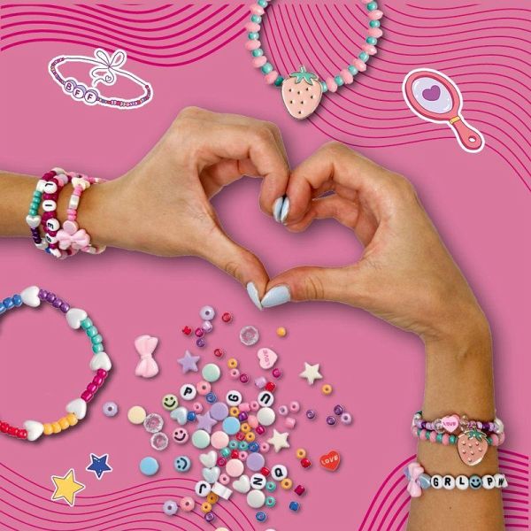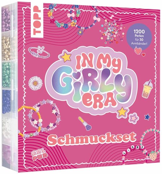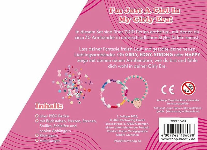 In diesem Komplettset sind über 1.200 Perlen enthalten, mit denen du circa 30 Armbänder in unterschiedlichen Styles fädeln kannst. Lass deiner Fantasie freien Lauf und gestalte deine neuen Lieblingsarmbänder. Ob GIRLY, EDGY, STRONG oder HAPPY zeige mit deinen neuen Armbändern, wer du bist und fühle dich wohl in deiner Girly Era!