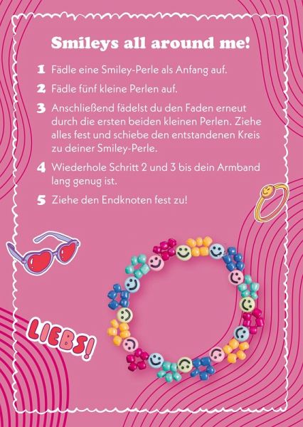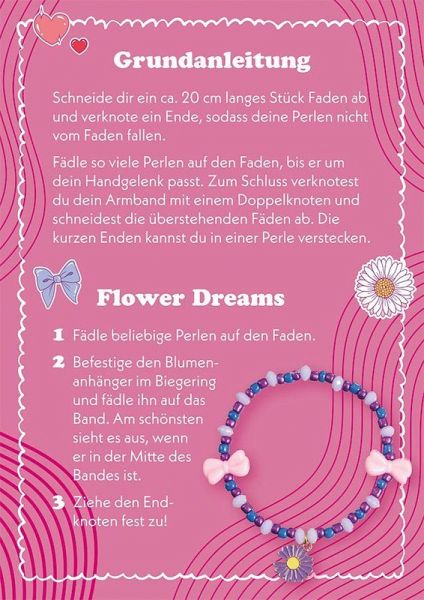 Material für ca. 30 Armbänderüber 1.200 Perlenmit Buchstaben- (2x Alphabet), Herz-, Smiley-, Schleifen- und Sternperleninkl. Blumen- und Herz-AnhängerElastikgarnAltersempfehlung: ab 10 Jahren