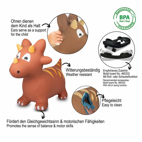 Neu im Programm von JAMARA ist der formschöne Hüpfdino. Ein Hüpftier das so schön geworden ist, das es im Sturm die Herzen der Kids erobern wird. Der Dino verspricht nicht nur jede Menge Hüpfspaß sondern fördert gleichzeitig den Gleichgewichtssinn und die motorischen Fähigkeiten. Das pflegeleichte Hüpftier, das mit der beiliegenden Luftpumpe kinderleicht in Form zu bringen ist, erweist sich im Alltag als sehr robust und widerstandsfähig und kann somit auch im Garten oder auf der Terrasse zum Einsatz kommen. Die Ohren des Hüpftieres dienen zum festhalten und geben dem Kind einen sicheren Halt auf dem neuen Spielgefährten. Der Dino ist BPA frei und reiht sich nahtlos in die große Reihe der liebevoll ausgesuchten Hüpftiere von JAMARA ein. Neben Pferd, Kuh, Lama, Einhorn usw. ist der kleine Triceratops sicher eines der Highlights im Hüpftierprogramm.