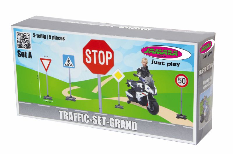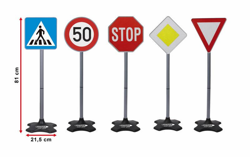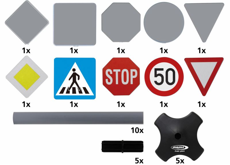 Sicherheit im Straßenverkehr spielerisch trainieren mit den Verkehrsschilder-Sets von Jamara. Mit jeweils 5 verschiedenen Straßenschildern im Set können die Kleinen spielerisch die wichtigsten Verkehrsregeln und Verhaltensweisen im Straßenverkehr erlernen. Die Verkehrszeichen eignen sich auch hervorragend für den Einsatz als Lern-Parcours im Unterricht. Die Schilder bestehen aus stabilem aber leichtem Kunststoff, sodass sich die Kinder bei einem Zusammenstoß nicht verletzen können. Jedes Verkehrsschild besteht aus 4 Elementen, die sich kinderleicht zusammenstecken lassen. Ergänzend zu den Verkehrsschildern bietet Jamara die passende Ampel.Highlights:- Set mit 5 verschiedenen Verkehrsschildern: Stop, Fußgängerüberweg, Höchstgeschwindigkeit 50, Achtung, Vorfahrtstraße- Leichte Montage durch zusammensteckbare Elemente- Robuster, leichter Kunststoff