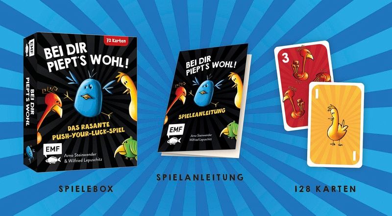 Bei diesem verrückten Spiel zieht ihr Karten vom Stapel und legt sie verdeckt oder offen an die Kartenreihe an. Wer richtig erkennt, ob schon zu viele Vögel in der Kartenreihe liegen, wirft der Person, die vorher an der Reihe war, "Bei dir piept's wohl!" vor und erhält Karten, die später wertvolle Punkte einbringen. Doch aufgepasst: Wer zu viel wagt oder sich verschätzt, beschert den Mitspielenden die Punkte! Das Spiel endet, wenn der Nachziehstapel aufgebraucht ist. Es gewinnt der Spaßvogel ähh ... die Person mit der wertvollsten Vogelsammlung.