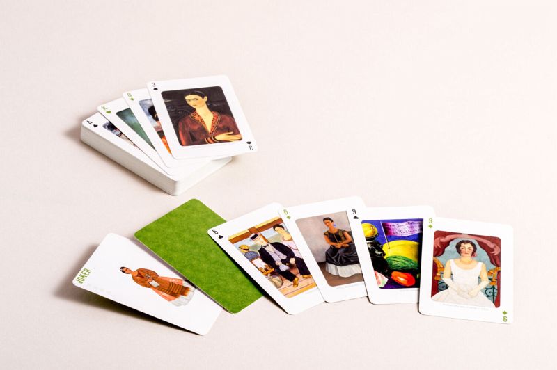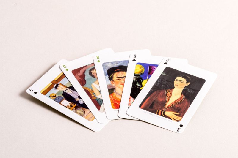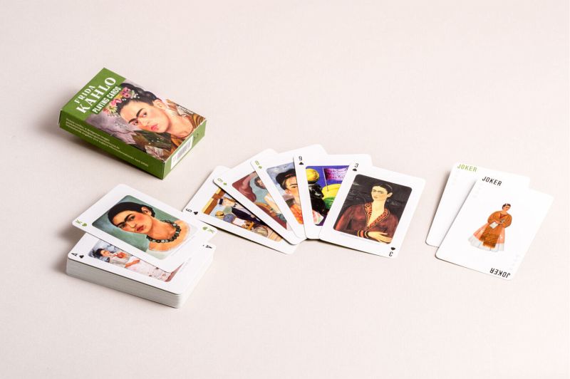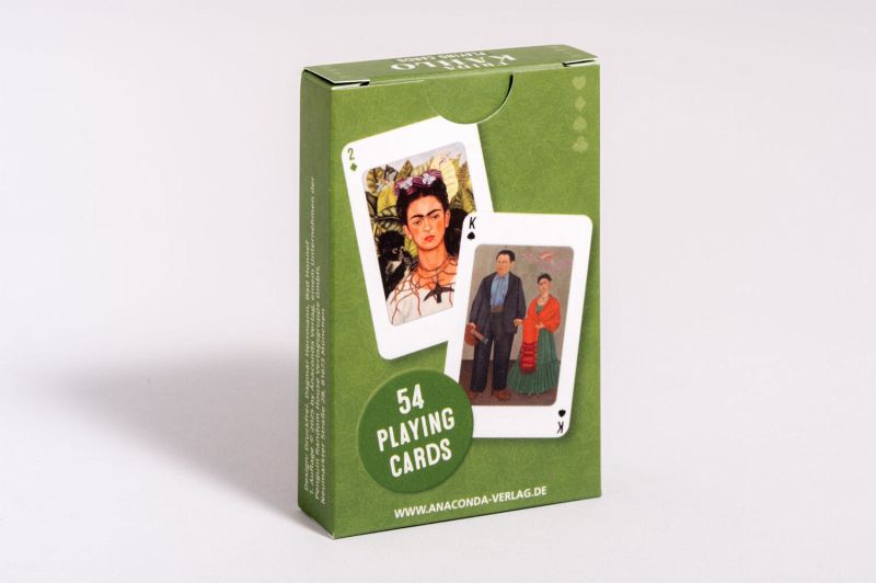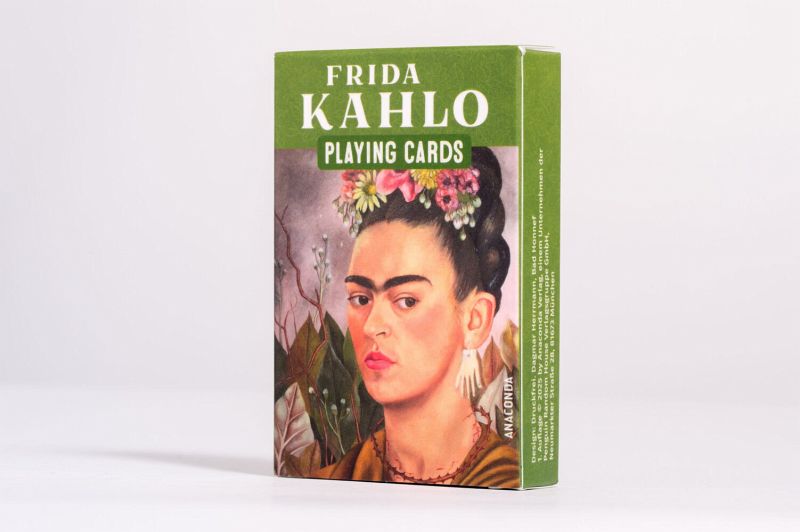 Frida Kahlo (1907-1954) gilt als bedeutendste Vertreterin des volkstümlichen Surrealismus. In ihren farbenprächtigen Werken thematisierte die mexikanische Malerin vor allem physische und psychische Leiden wie ihre Behinderung infolge eines Busunfalls oder die dramatische Ehe mit Malerkonkurrent Diego Rivera. Zeitlebens kämpfte sie um künstlerische Anerkennung, die ihr letztlich erst posthum zuteilwurde. Heute sind Kahlos Werke gefragter denn je und die feministische Popkultur feiert ihre ikonischen Selbstporträts. Mit diesem besonderen Kartenset haben sie bei jedem Spiel ein gutes Blatt auf der Hand.