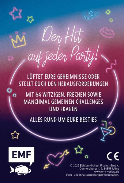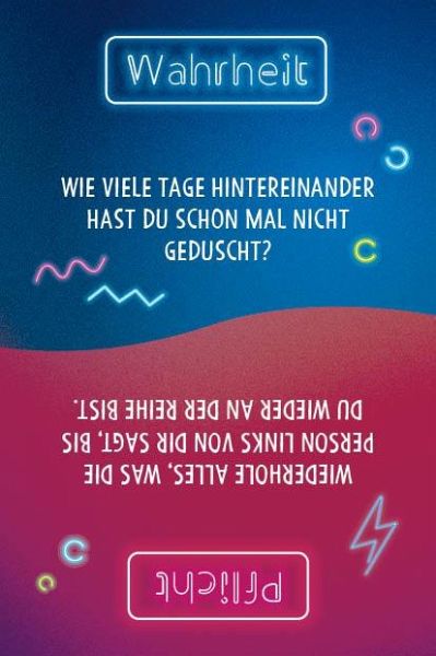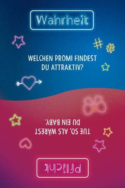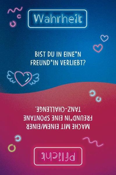 Wahrheit: "Welches Erlebnis in einer Freundschaft hat dich am meisten geprägt?" Pflicht: "Erzähle eine peinliche Geschichte über dich und dein_e Besties." Wahrheit oder Pflicht - seit jeher der Hit auf jeder Party! Jetzt im praktischen Kartenformat für zu Hause, unterwegs oder als Geschenk. Mit individuell auf Freundschaft zugeschnittenen Fragen und Aufgaben zum Spaß haben, Staunen und besser Kennenlernen. Wahrheit oder Pflicht - wie entscheidest du dich?