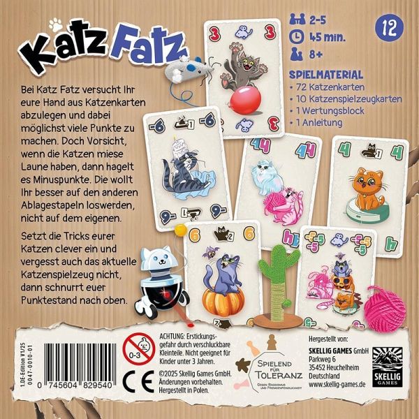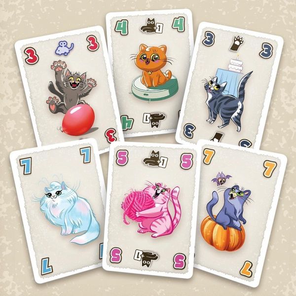 Bei Katz Fatz versucht Ihreure Hand aus Katzenkarten abzulegen und dabei möglichst viele Punkte zu machen. Doch Vorsicht, wenn die Katzen miese Laune haben, dann hagelt es Minuspunkte. Die wollt Ihr besser auf den anderen Ablagestapeln loswerden, nicht auf dem eigenen.