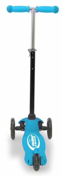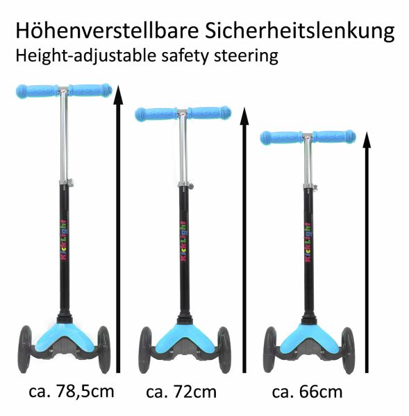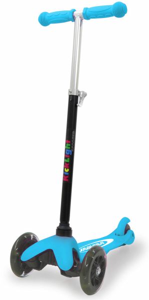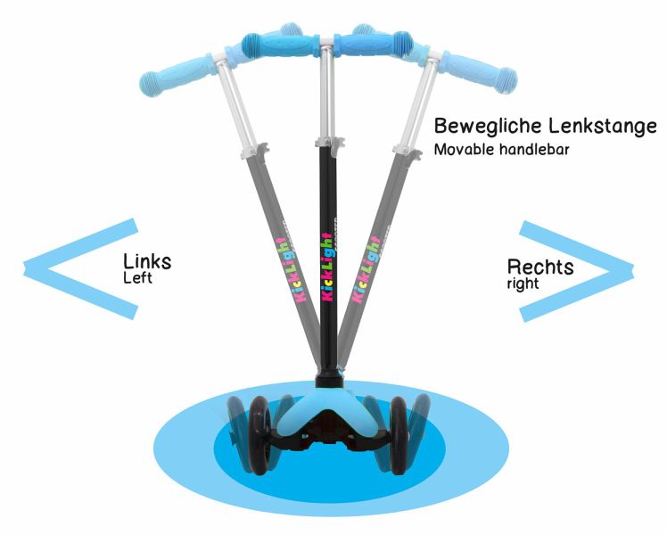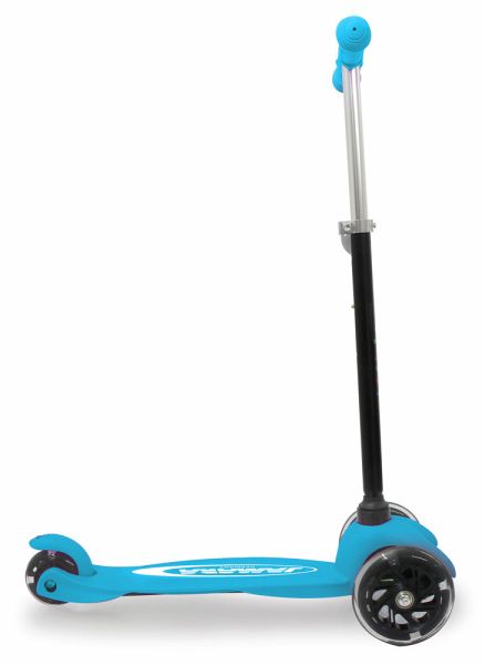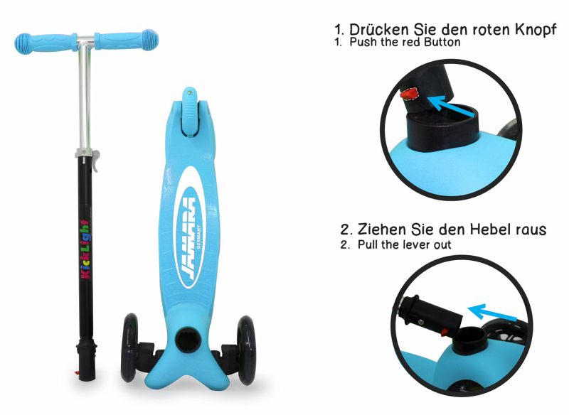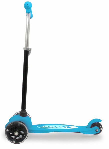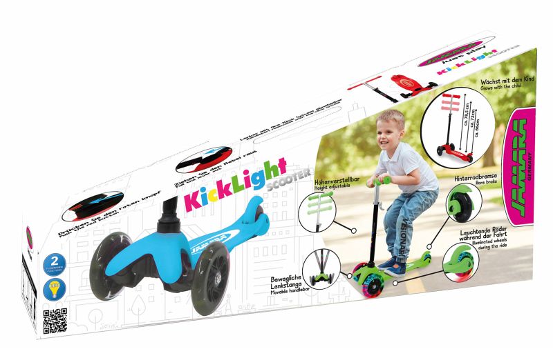 Der Kick-Light-Scooter von JAMARA ist ein Must-Have Spaßgerät für coole Kids. Mit seinen knalligen Farben und der stabilen Konstruktion ist der Roller gleich auf den ersten Blick ein echter Hingucker. Die Lenkstange ist zur Richtungsänderung beweglich und zur Anpassung der Größe höhenverstellbar und bietet dank den Vollgummigriffen mit Sturzpads Grip und Schutz gleichzeitig. Mit einem Klick ist die Lenkstange abnehmbar und der Roller kann so leicht und platzsparend transportiert werden. Am auffälligsten sind aber die coolen LED Räder vorn und hinten die beim Drehen in bunten Farben leuchten (keine Batterie nötig). Mit zwei großen Rollen vorne und einer Rolle mit Fußbremse hinten und den eingebauten robusten ABEC7 Kugellagern, ist der JAMARA Kick Light Scooter ideal für kleine Fahranfänger und optimal zum Training des Gleichgewichtssinnes.