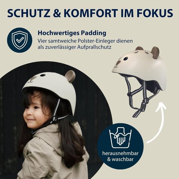 Was haben Laufrad-Helden und Roller-Queens gemeinsam? Genau, den passenden Helm! Mit Beary sind unsere Youngsters immer stylish und sicher unterwegs. Doch der neue Kopfschutz im Bären-Look ist nicht nur supersüß anzuschauen. Auch in Sachen Ausstattung macht ihm so schnell keiner was vor. Der Kinderhelm ist dank innovativer In-Mold-Bauweise besonders widerstandsfähig, aber dennoch leicht. Zudem bieten vier innenliegende Schaumpolster optimalen Rundumschutz. Nicht nur das samtweiche Padding, das sich übrigens einfach herausnehmen und waschen lässt, macht das Tragen komfortabel. Neun Vents auf der Helmoberseite bieten den Kids optimale Belüftung. Damit der Kinderhelm auch immer gut sitzt, lässt er sich im Handumdrehen per Drehverschluss an den Kopfumfang anpassen. Beary ist in zwei Größen erhältlich und gewinnt mit den Trendfarben Ivory, Mocha und Black sicher jede Menge Fans. Wir sagen jetzt schon: Hallo Eyecatcher!