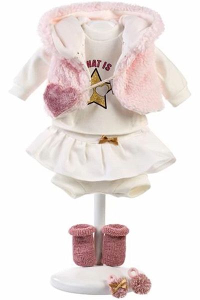 Stylisches Kleiderset mit goldigem Sternmotiv kombiniert mit Höschen in weiss sowie altrosa Söckchen und rosa Weste. Inkl. einer altrosa Umhängetasche in Herzform und passenden Pom-Poms. Passend für 40cm - 42cm Puppen.