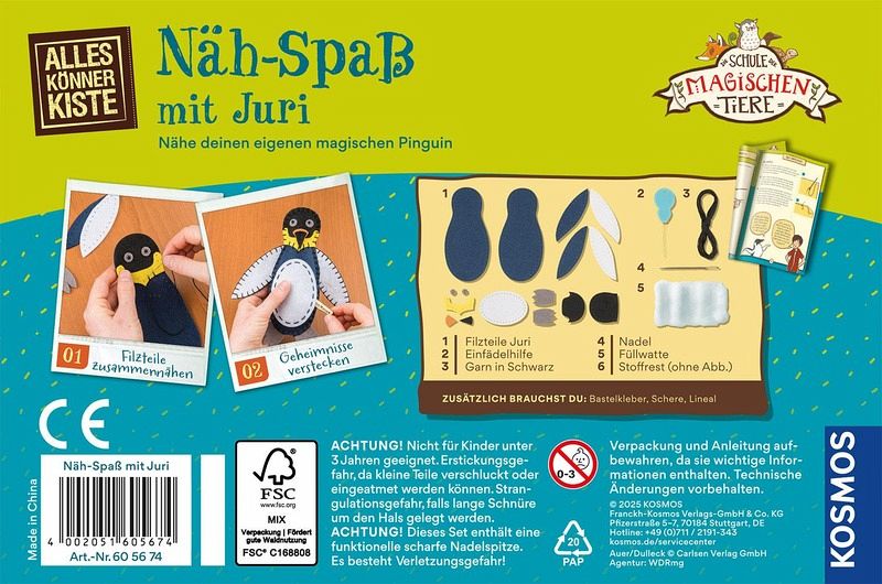 Spielerisch Grundlagen des Nähens lernen. Pinguin Juri mit Geheimfach für kleine Notizen und Wünsche. Cooles Bastelprojekt für Kinder ab acht Jahren. Ausführliche und altersgerechte Anleitung. Kreatives Komplettset mit Filz, Garn, Füllwatte, Nadel & Einfädelhilfe. Tolles Geschenk und Mitbringsel. Für Fans der Erfolgsreihe "Die Schule der magischen Tiere" von Autorin Margit Auer mit den Buchillustrationen von Nina Dulleck. Bei Pinguin Juri ist jedes Geheimnis sicher! Stich für Stich wird das magische Tier zum Leben erweckt. Wie werden die Filzstücke zusammengenäht? Wie heißen die unterschiedlichen Stiche? Wie kommt die Füllwatte in die Figur? Die farbig illustrierte Anleitung führt durch die einzelnen Schritte. Sie erklärt anschaulich, wie Anfangsknoten, Heftstich und Schlingstich garantiert gelingen. Einfach den vorgestanzten Löchern folgen und Pinguin Juri kinderleicht zusammennähen. Geniales Extra: In Juris Bauch lassen sich perfekt kleine Geheimnisse verstecken. Für "Die Schule der magischen Tiere"-Fans ab acht Jahren ist das DIY- Nähset ein tolles Geburtstagsgeschenk!