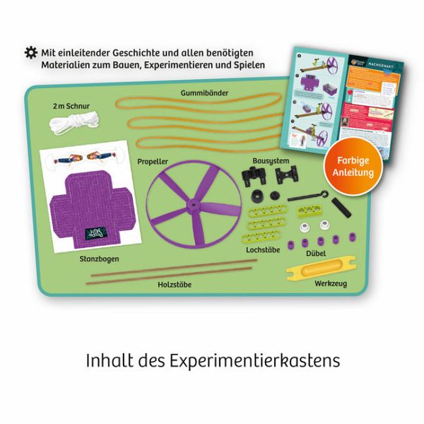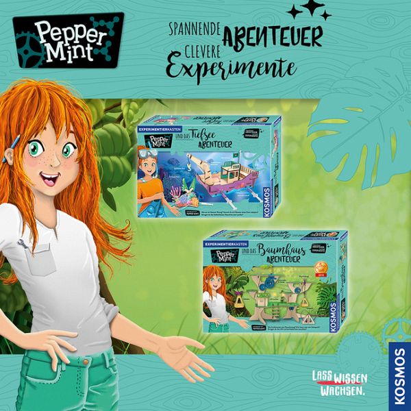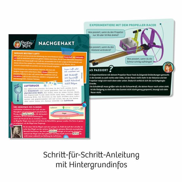 Mit Pepper Mint Aufgaben mit Köpfchen, Kreativität und physikalischem Hintergrund lösen - MINT spielerisch entdecken. Ein neues Abenteuer wartet auf Kinder von 8 bis 12 Jahren: Mit diesem Set können sie Pepper in einer Seilbahn mit Propeller-Antrieb quer durchs Zimmer flitzen lassen! Ein KOSMOS Mitbring-Experimentierkasten mit einleitender Geschichte, allen benötigten Materialien zum Bauen und Experimentieren und einer Pepper-Spielfigur aus Pappe. Dieses Set lässt sich mit allen weiteren Experimentierkästen aus der Reihe "Pepper Mint" kombinieren - zum Beispiel mit dem "Abenteuer Baumhaus". Pepper Mint mag wirklich vieles, aber morgens früh aufzustehen, gehört definitiv nicht dazu. Als der Wecker sie mal wieder aus einem wilden Traum reißt, kommt ihr die rettende Idee... Statt jeden Morgen zu Fuß in die Schule zu laufen, könnte sie mit einer Seilbahn direkt aus ihrem Bett ins Klassenzimmer fahren! Sofort macht sie sich ans Werk und startet in ihr nächstes Abenteuer: Sie konstruiert ihren Propeller-Racer! Gemeinsam mit Pepper bauen Kinder von 8 bis 12 Jahren mit diesem KOSMOS Experimentierset eine pfiffige Seilbahn, die sie quer durch ihr Zimmer sausen lassen können. Den nötigen Antrieb bekommt der Racer durch ein Gummiband, das erst aufgezwirbelt und dann gelöst wird. Blitzschnell schießt der Racer zusammen mit der Passagier-Gondel am Seil entlang und bewältigt sogar Steigungen.