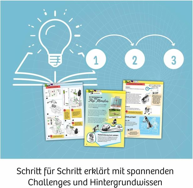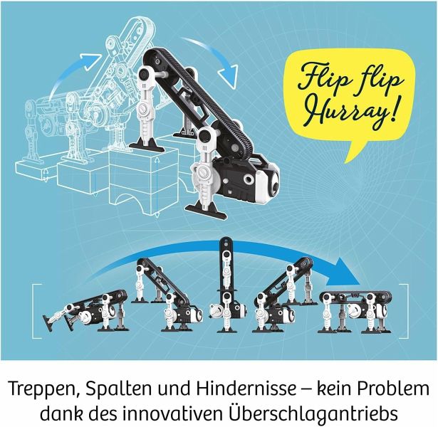 Stufen, Abgründe oder selbstgebaute Hindernis-Parcours: Für ihn ist kein Hindernis zu hoch – oder doch? Dank einfachstem Aufbau mit großen Teilen und wenigen Schrauben sowie batteriebetriebenem Antrieb können technikbegeisterte Kinder ab zehn Jahren ganz einfach selbst die Grenzen des Flip-Roboters austesten und lernen gleichzeitig alles über Robotik und den innovativen Überschlag-Antrieb. Und das Beste: Ist das Flip-Monster einmal zu Fall gekommen, richtet es sich von allein wieder auf und der verrückte Flip-Spaß kann weitergehen!