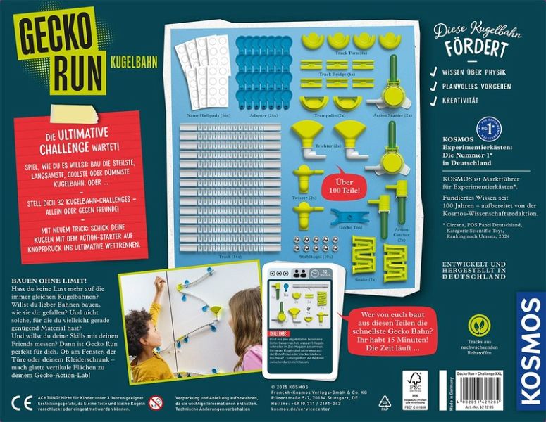 Wer gewinnt die nächste Challenge und erreicht das Ziel zuerst?! Mit 32 kniffligen Aufgabenkarten-Karten geht die rasante senkrechte Kugelbahn in die nächste Runde. Ob allein oder zu zweit, ob im Team oder gegeneinander, mit dem neu entwickelten Kugelstarter und dem Auffangbehälter gilt es jetzt, eine der 32 Challenges zu meistern. Dabei steht freies Bauen ohne Grenzen an erster Stelle, denn die diese KOSMOS Kugelbahn haftet dank cleverer Nanopads an allen glatten Oberflächen wie Fliesen, Schränke oder Fensterscheiben! Eine Vielzahl an zusätzlicher Tricks und Elementen bereichert die Bahn, so dass es immer neue Möglichkeiten zu entdecken gibt! Challenge-Karte ziehen und los geht`s! Unser Tipp: Gecko Run erweitert auch andere Kugelbahnen in luftige Höhen, denn dank der standardisierten Stahlkugeln ist sie mit den gängigen Bahnen im Markt kombinierbar.