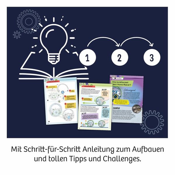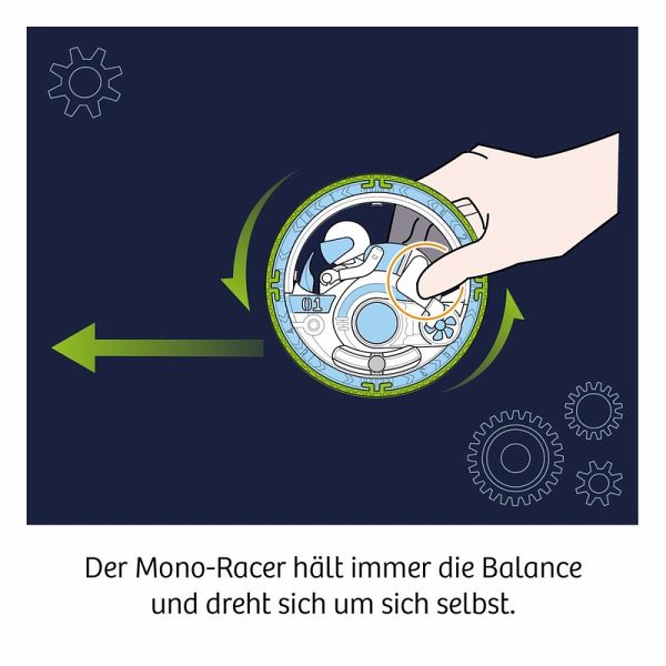 Zusammenbauen und los geht das Rennen auf nur einem Rad! Dank verblüffender gyroskopischer Effekte hält der Racer seine Balance. Einfach zusammenbauen, das Schwungrad mechanisch mit Energie aufladen und schon flitzt der Racer über den Boden. Ganz ohne Batterien und nur mithilfe von Rotationsenergie lässt sich das Modell immer wieder neu laden und sorgt für unendlichen Spiel-Spaß. Die umfangreiche Anleitung erklärt nicht nur den Aufbau und die Funktionsweise, sondern hält viele Challenge-Ideen und Hindernis-Parcours bereit. Einfach ausprobieren! Dieser KOSMOS Experimentierkasten eignet verblüffende Phänomene mit einem tollem Spielerlebnis und gibt Kindern ab acht Jahren erste Einblicke in die Welt der Physik. Hier treffen zwei physikalische Phänomene aufeinander und sorgen für Action! Einmal zusammengebaut, lässt sich das große Schwungrad des Mono-Racers mechanisch mit Energie aufladen und schon flitzt der Racer mühelos auf einem nur Rad über den Boden. Doch warum kippt er nicht einfach um? Gyroskopische Effekte machen es möglich und halten den Racer stabil. Erklärt werden diese Effekte für Kinder in der leicht verständlichen Anleitung, die neben einer Aufbauanleitung und spannenden Wissensfacts auch kreative Challenge-Ideen bereithält. Ob im Hindernis-Parcours oder auf der Jagd nach neuen Highscores - mit dem Mono-Racer bleibt´s spannend!