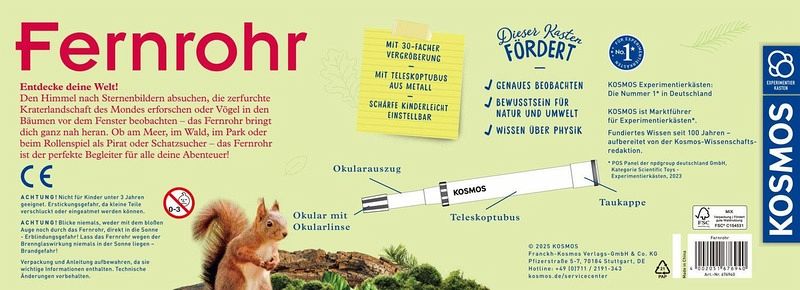 Die zerfurchte Kraterlandschaft des Mondes erforschen oder Vögel und Eichhörnchen in den Bäumen beobachten - das Linsenfernrohr bringt mit seiner 30fachen Vergrößerung alles ganz nah heran. Das Fernrohr von KOSMOS lässt sich ganz einfach und exakt einstellen, sodass es für Kinder besonders einfach ist, Tiere zu beobachten oder den Himmel nach Sternen abzusuchen. Dank des Teleskopkubus aus Metall ist das Fernrohr robust und langlebig. Da es obendrein sehr leicht ist, ist es der perfekte Begleiter bei Ausflügen, im Urlaub, bei Naturbeobachtungen oder im Rollenspiel. Die Anleitung erklärt, wie ein Linsenfernrohr aufgebaut ist und hält Tipps bereit, wie man es am besten für seine Beobachtungen einsetzt. Ein Experimentier-Set von KOSMOS, das Kinder von 8 - 12 Jahren zu Entdeckern werden lässt und einen neuen, spannenden Blickwinkel in Natur und Umgebung ermöglicht. Den Himmel nach Sternenbildern absuchen, die zerfurchte Kraterlandschaft des Mondes erforschen oder Vögel im Wald oder vor dem Fenster beobachten - das Fernrohr von KOSMOS bringt Kindern unerreichbare Welten ganz nah heran. Das Linsenfernrohr mit der 30fachen Vergrößerung und dem Metall-Teleskopkubus lässt sich leicht und präzise einstellen. In der Anleitung erfahren Kinder von 8 bis 12 Jahren wie ein Linsenfernrohr aufgebaut ist und wie man es am besten für seine Beobachtungen einsetzt. Ob am Meer, im Wald, im Park oder beim Abenteuer- und Rollenspiel als Pirat oder Schatzsucher - Dank seines robusten Äußeren ist das Fernrohr der perfekte Begleiter bei Ausflügen oder im Urlaub!