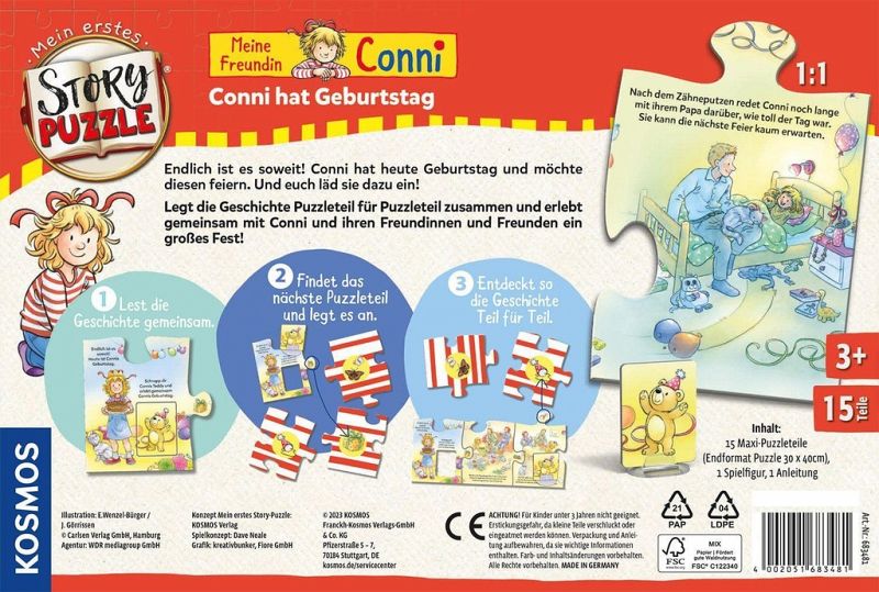 Conni begeistert seit 30 Jahren - jetzt auch als "Mein erstes Story-Puzzle". Conni hat Geburtstag! Mama, Papa, Jakob und ihre Freundinnen und Freunde sind auch schon da. Und was macht Kater Mau? Kinder ab drei Jahren puzzeln Stück für Stück eine Bilderbuchgeschichte zusammen. Die kurzen Texte auf den Puzzleteilen lassen sich die Kleinen von den Großen vorlesen. Das Puzzle ist fertig? Auch danach entdecken und erleben die Kinder die Kurzgeschichte weiter. Mein erstes Story-Puzzle: große, bunt gestaltete Puzzleteile machen aus dem Kinderbuch-Bestseller ein völlig neues Erlebnis.