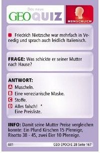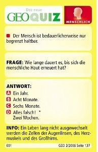 Inhaltlich gibt es allerdings nichts zu kritisieren. Die Fragekarten sind sehr übersichtlich strukturiert und geben sogar vor in welcher Ausgabe (Monat, Jahr, Seite) man den passenden Artikel zur Frage findet^^. Die Fragen gehen GEO-typisch über die klassischen Allgemeinbildungsfragen hinaus und befassen sich mit vielerlei abwechslungsreichen Themen, so dass bei 1000 Fragen so schnell keine Langeweile oder Wiederholungen vorkommen. So ergänzt das GEO-Quiz auch die eigene Quizspiele-Sammlung, da es neben den typischen Vertretern seine Eigenständigkeit beweist.