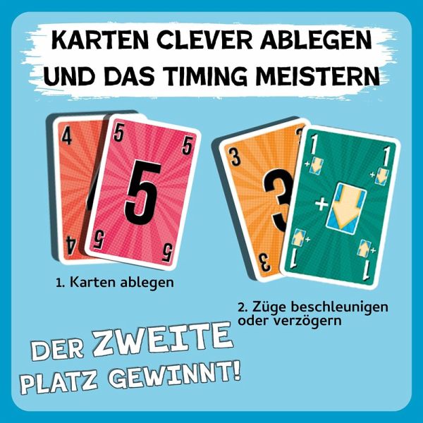 Schnell weg mit den Karten - aber doch nicht ZU schnell! Denn das Ziel bei diesem Kartenspiel lautet: Zweiter werden. Die Handkarten reihum auf den Ablagestapel spielen. Vorsicht! Taktisch klug spielen, um die Karten nicht als Erster, sondern als Zweiter loszuwerden. Dafür entweder eine höhere oder zwei niedrigere Karten auf die ausgelegte Karte abspielen. Zusätzlich geben Sonderkarten die Möglichkeit, das Timing zu beeinflussen. Wer es zuerst schafft, dreimal den zweiten Platz zu machen, gewinnt! Ein turbulentes und lustiges Kartenspiel für zwei bis fünf Spielerinnen und Spieler ab zehn Jahren.