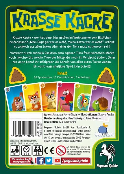 Na sowas! Da hat eins der Tiere doch glatt ein Häufchen in der Küche hinterlassen. Aber natürlich war es nicht mein Hamster, sondern der Papagei vom Nachbarn. Oder vielleicht doch eher die Schildkröte? In Who did it? müssen die Spieler möglichst schnell den Verdacht von ihren eigenen sechs Haustieren ablenken und die der Mitspieler beschuldigen. Wer die Unschuld aller seiner Tiere beweisen konnte, ist fein raus. Wer übrig bleibt muss hingegen die Hinterlassenschaften wegräumen. Who did it? ist ein witziges Kartenspiel, das in einer Minute erklärt ist und Groß wie Klein zum Lachen bringt. Das schräge Thema und die putzigen Illustrationen, zusammen mit der kurzen Spieldauer, machen es zu einem kleinen Highlight für zwischendurch und unterwegs.
