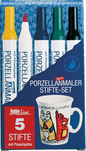Farbstifte mit formstabiler Pinselspitze zum Bemalen und Verzieren von Glas, Porzellan und glasierter Keramikware. Kinderleichte Anwendung (ohne Schütteln und Pumpen). Nach einer Trocknungszeit von mind. 4 Stunden den bemalten Gegenstand in den kalten Backofen stellen. Den Ofen auf 160°C einstellen. Wenn die Temperatur erreicht ist, für mind. 30 Minuten einbrennen. Ofen ausschalten. Im Backofen abkühlen lassen. Gegenstand ist nach dem Einbrennen spülmaschinengeeignet. Inhalt: 5 PorcelainPENs mit Pinselspitze in Gelb, Kirschrot, Dunkelblau, Dunkelgrün, Schwarz Für Kinder ab 3 Jahren geeignet.